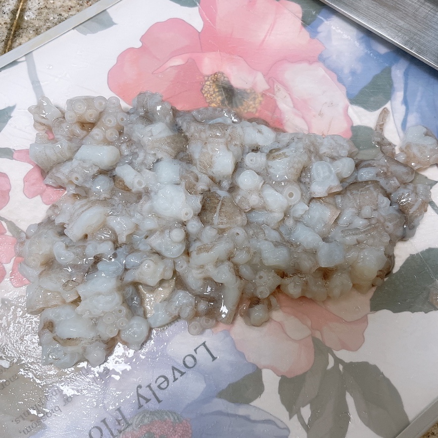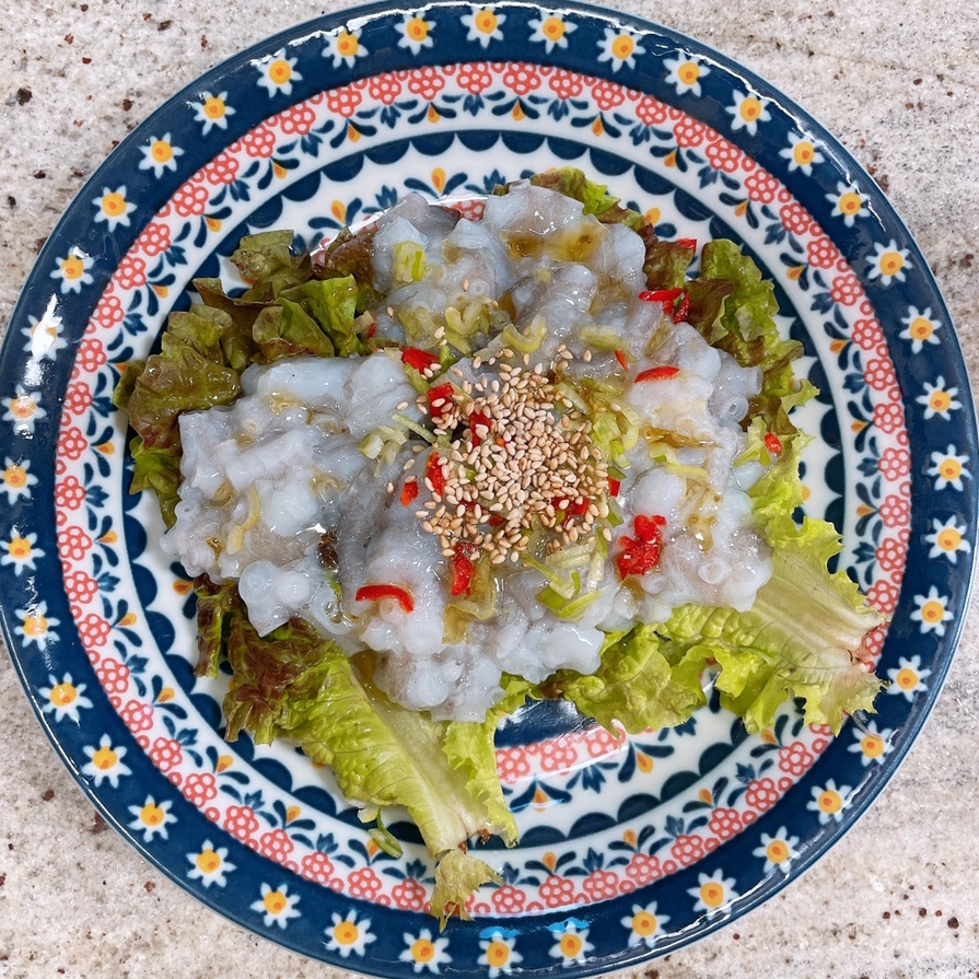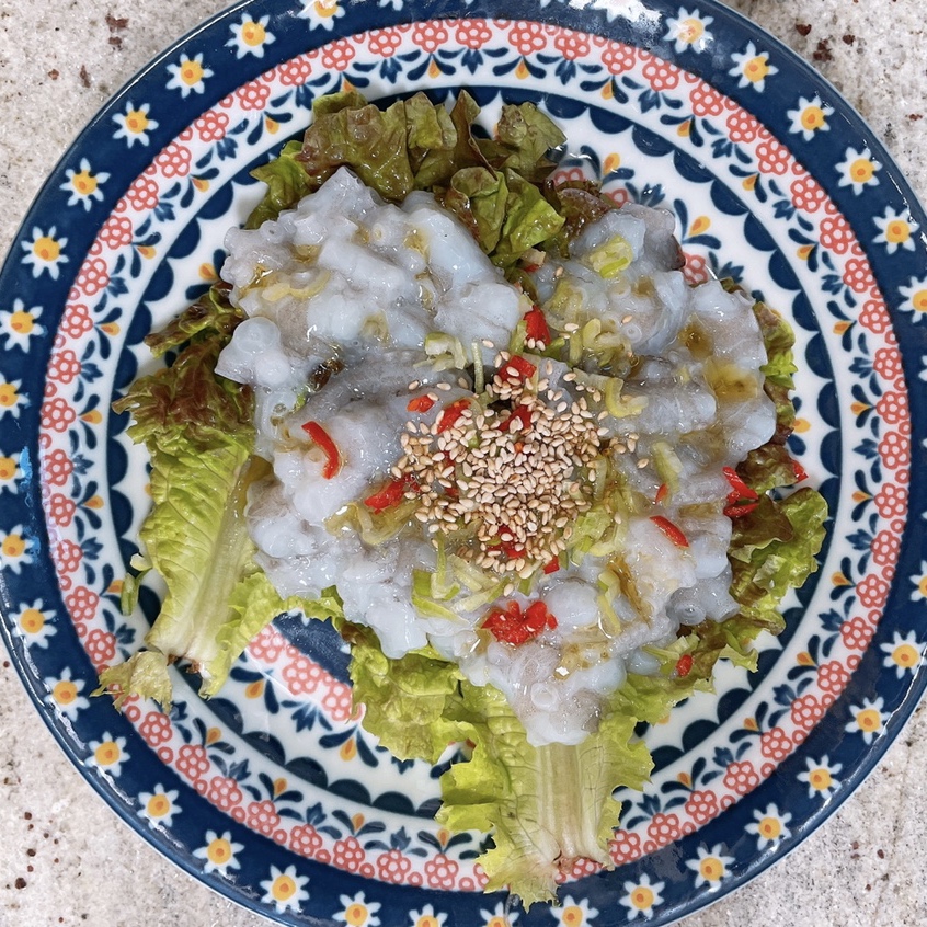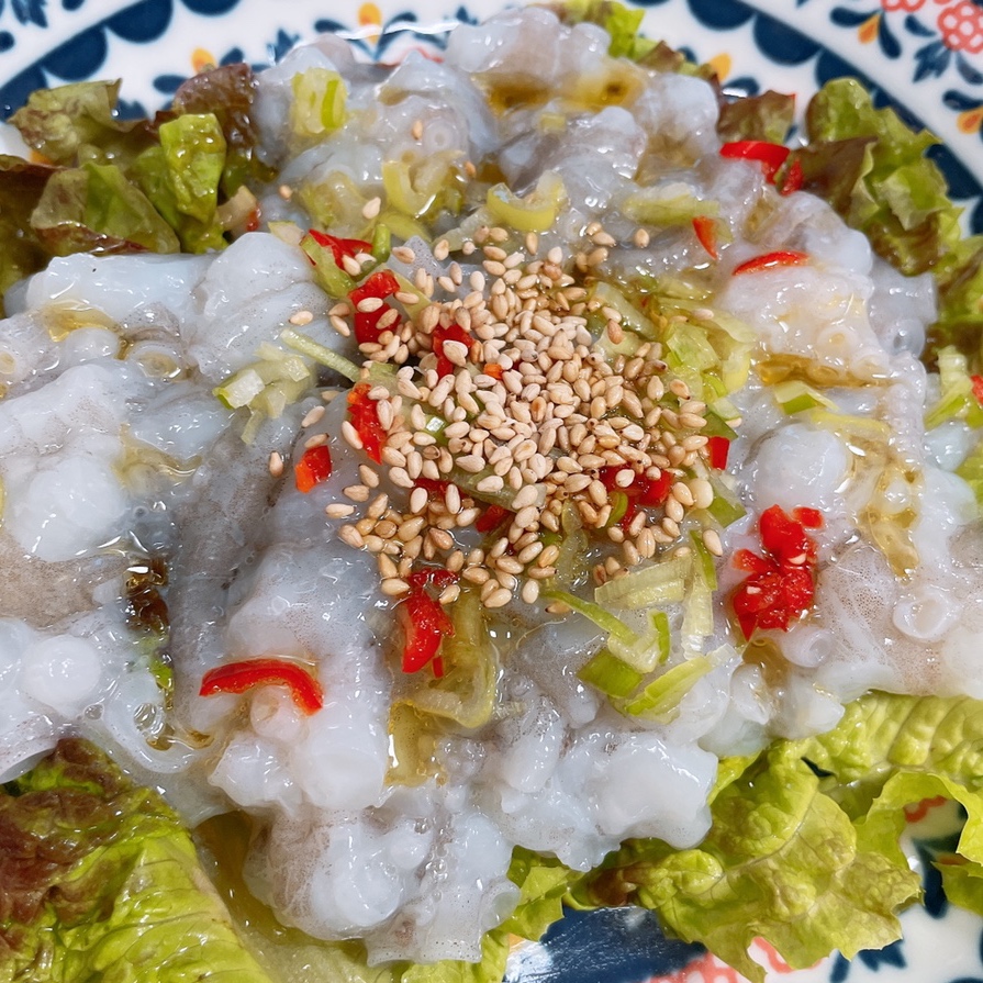 낙지 한마리(다리만), 홍고추 1/3개, 대파 3cm, 통깨 4번 톡톡, 참기름 1t, 소금 조금