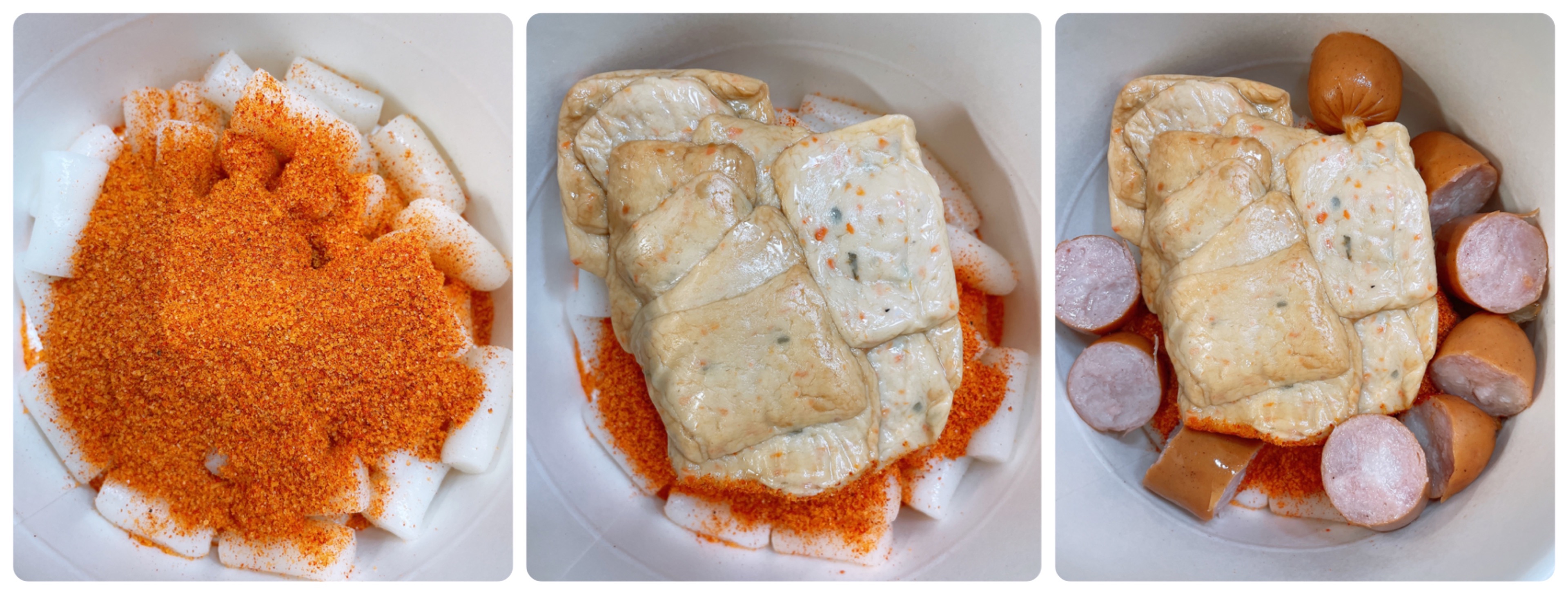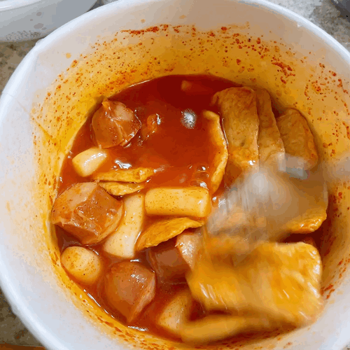 떡-스프-어묵-끓는 물 140ml 넣고 잘 저어준다.