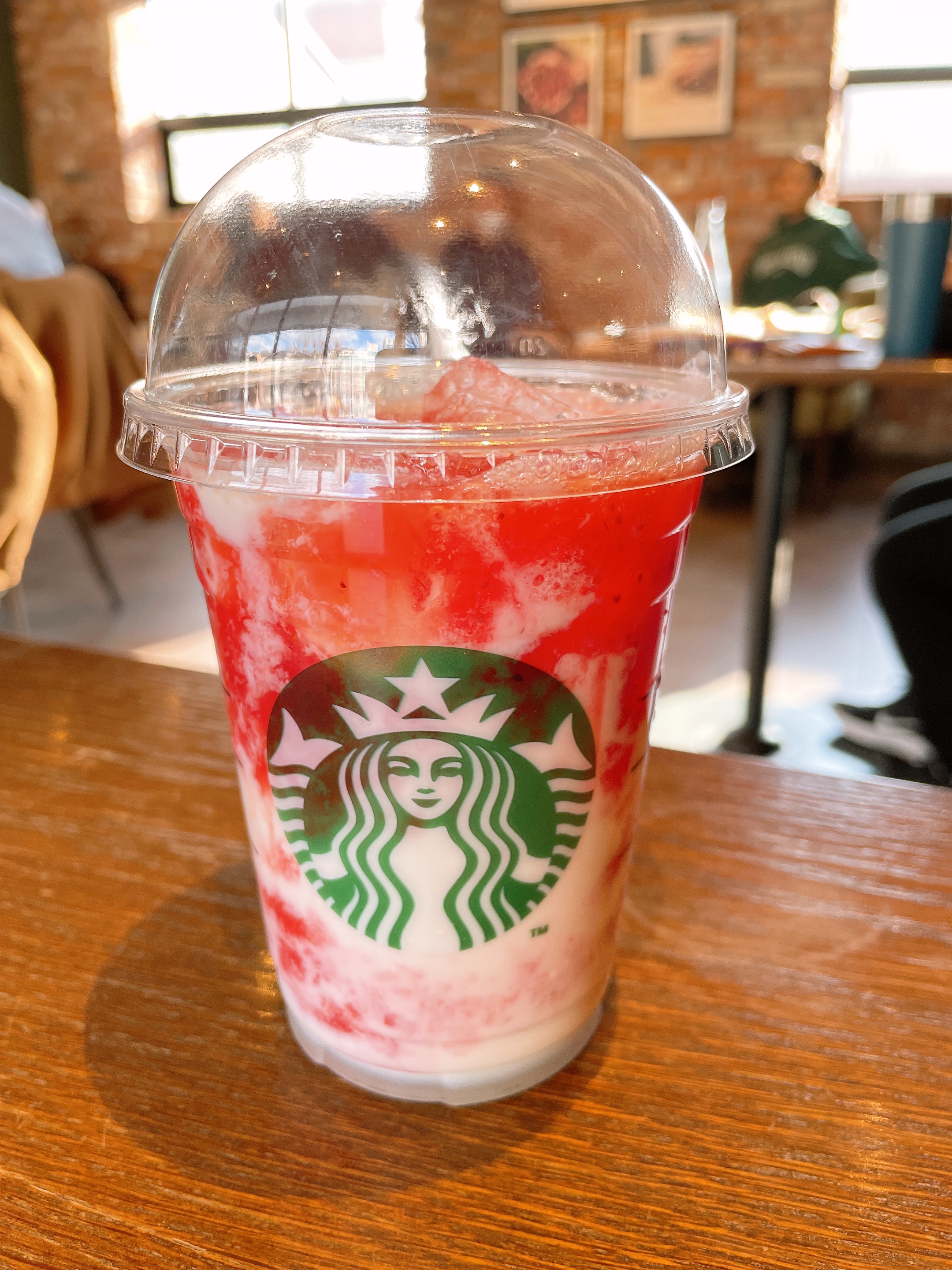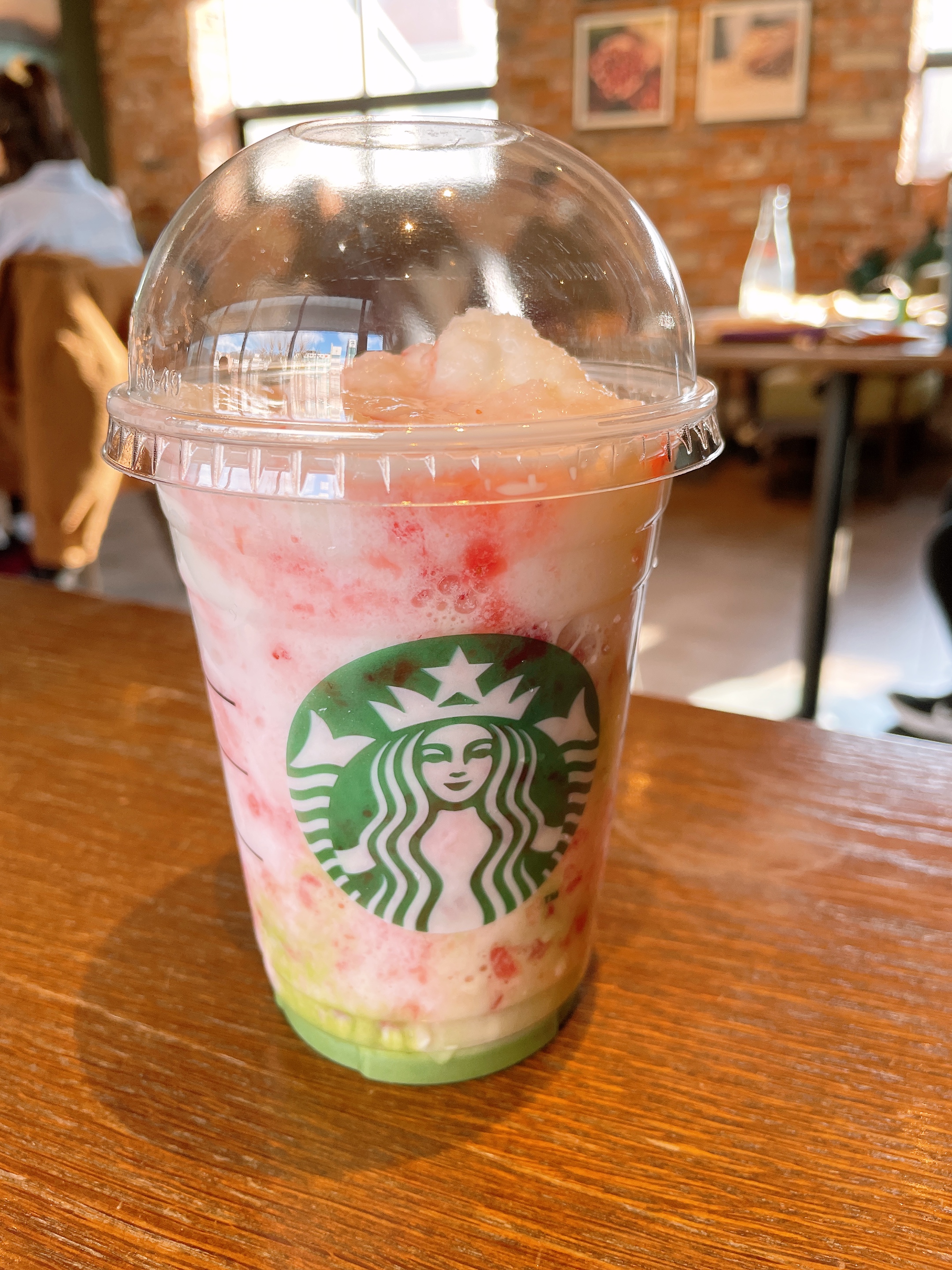 말차+딸기+바닐라 프라푸치노 조합의 음료로