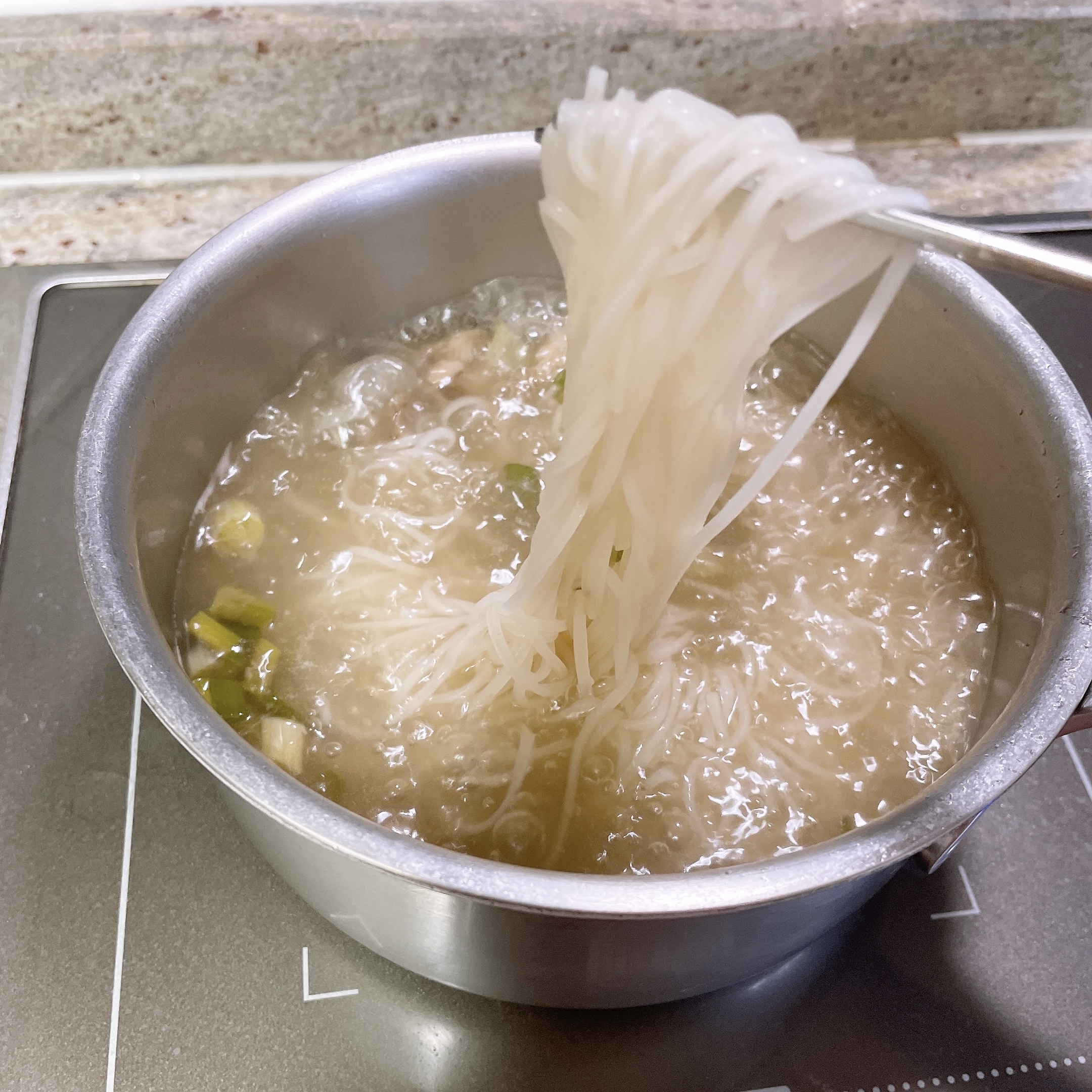 불려둔 당면과 파를 넣고 보글보글 끓여봤다.