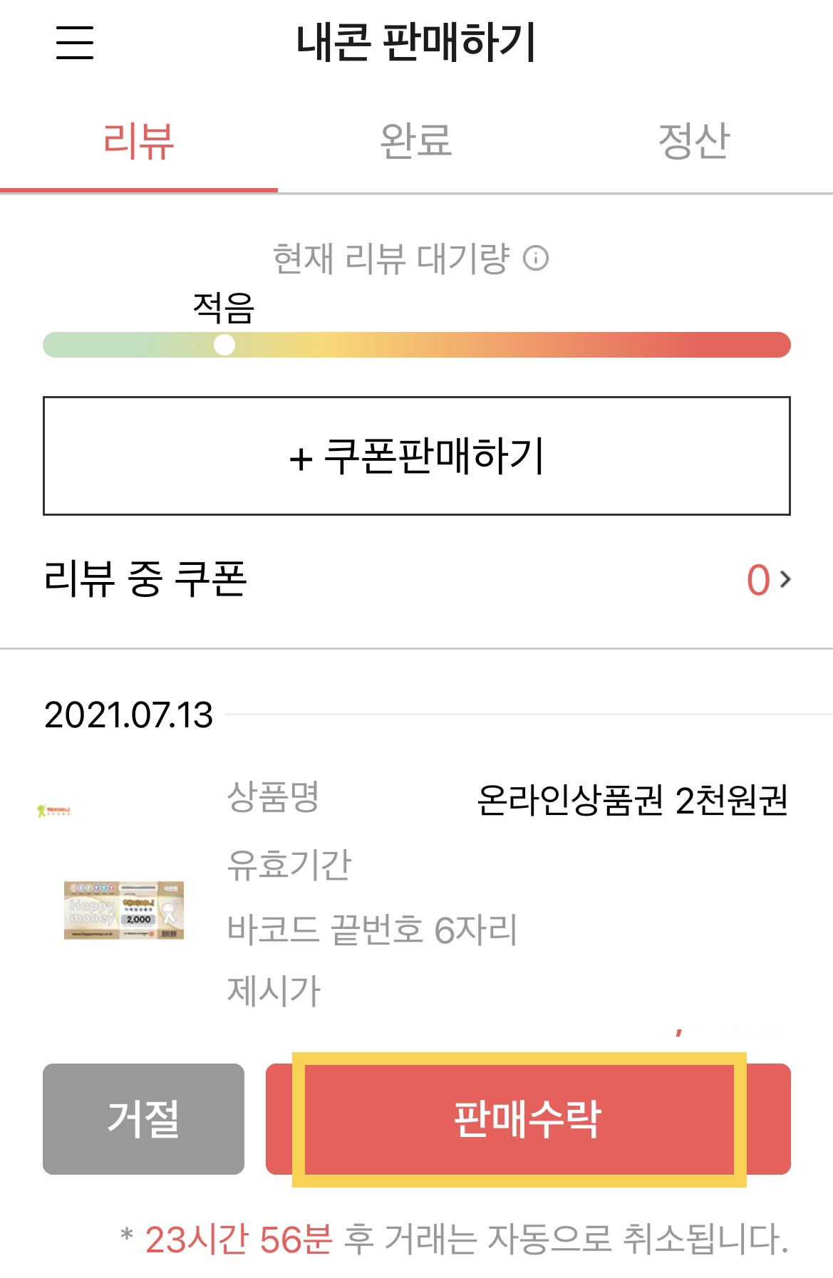 9. 리뷰가 끝나면 알람이 뜨고(알람 설정 시) 24시간 내에 거절/판매수락을 선택하면 된다.