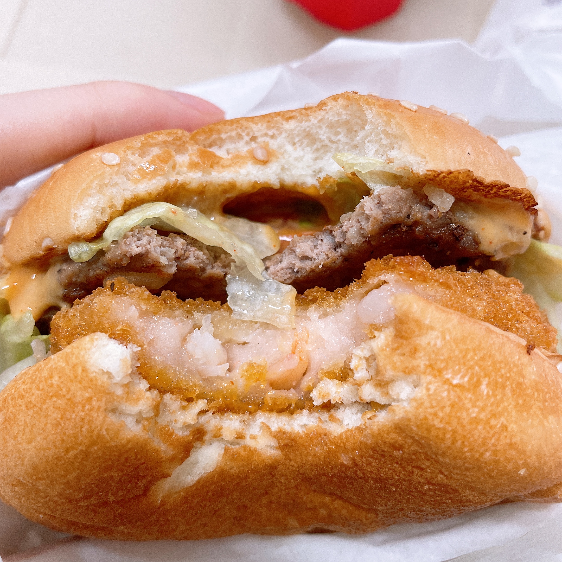 통새우살이랑 비프 패티에 살짝 매콤한