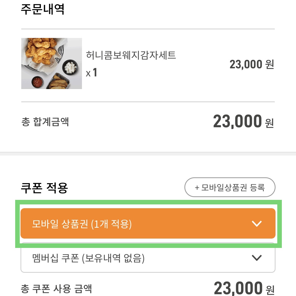 허니콤보웨지감자세트는 23,000원으로