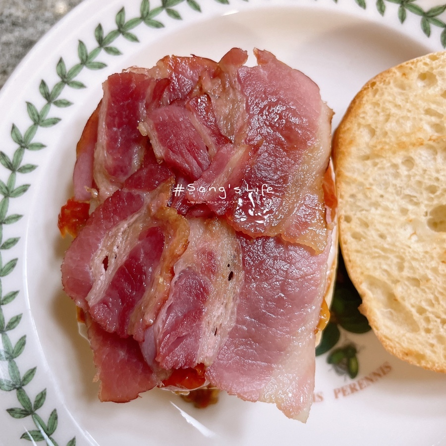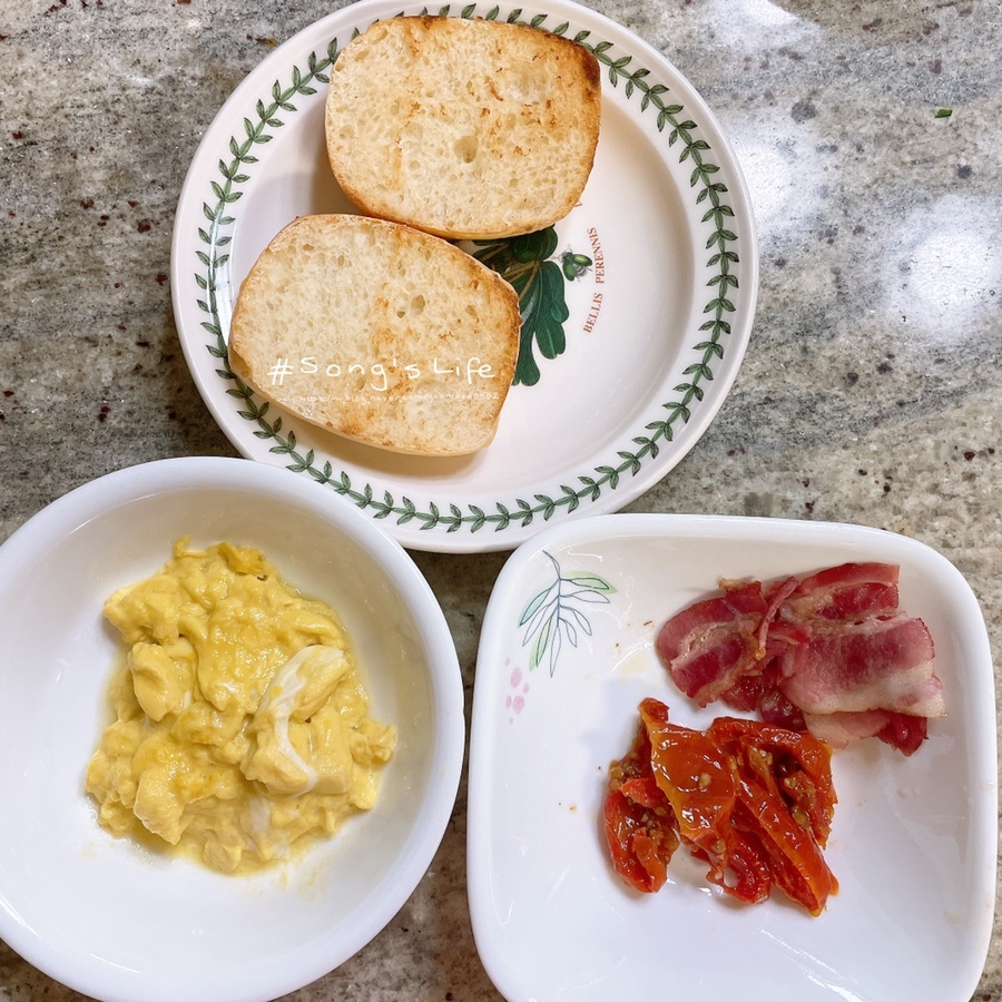 모닝빵, 계란, 토마토, 베이컨 준비해서
