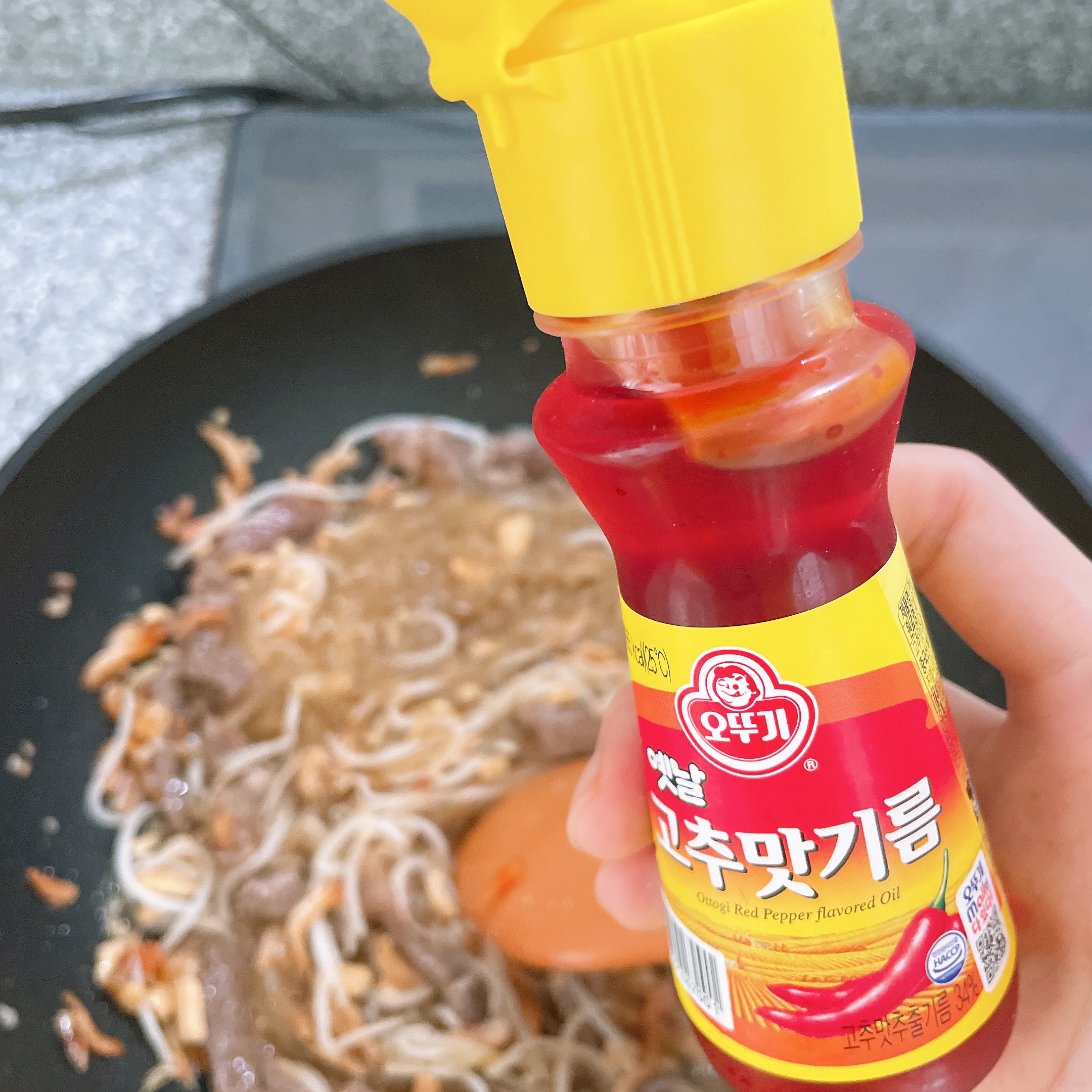 마지막에 고추기름을 둘러 매콤함을 더해준다.