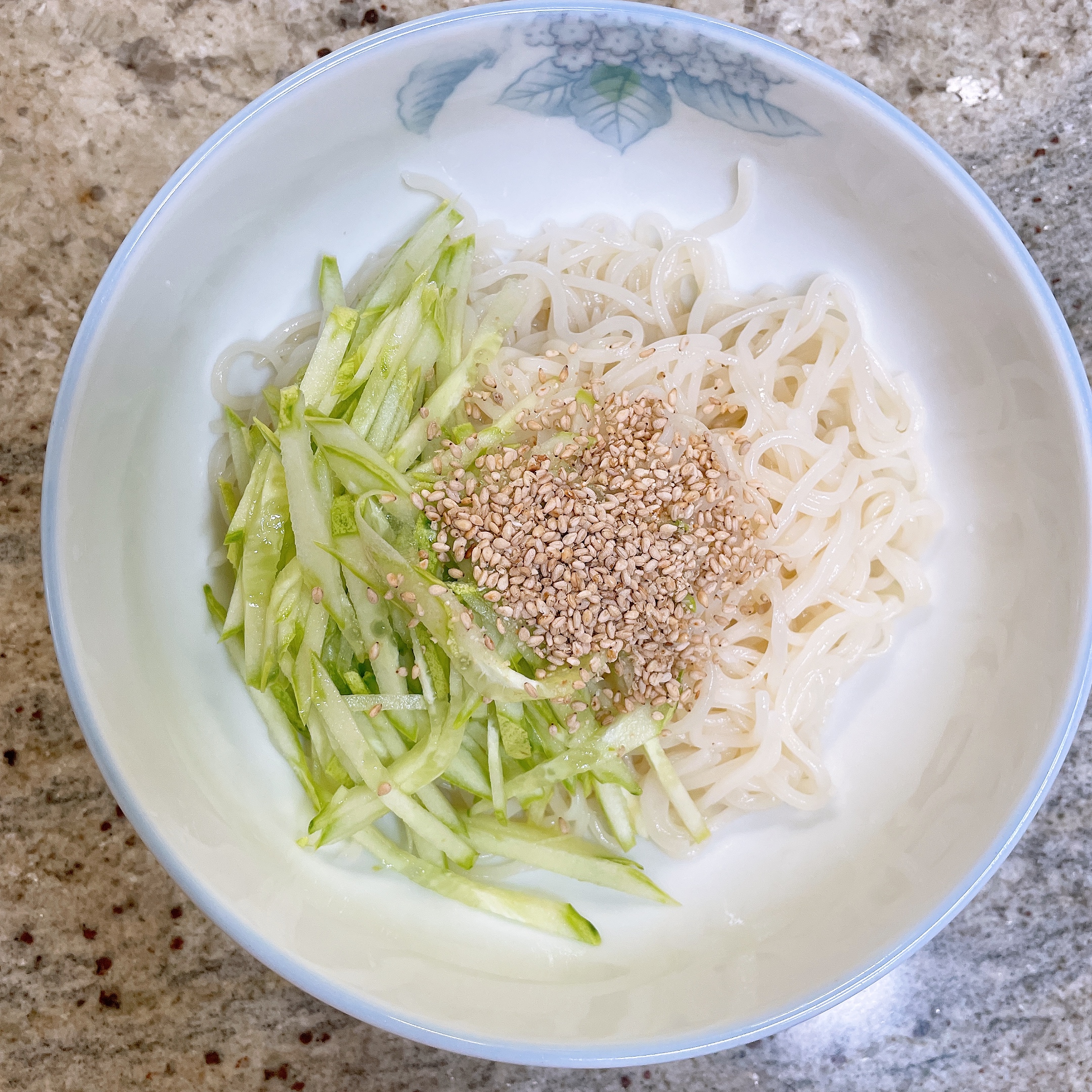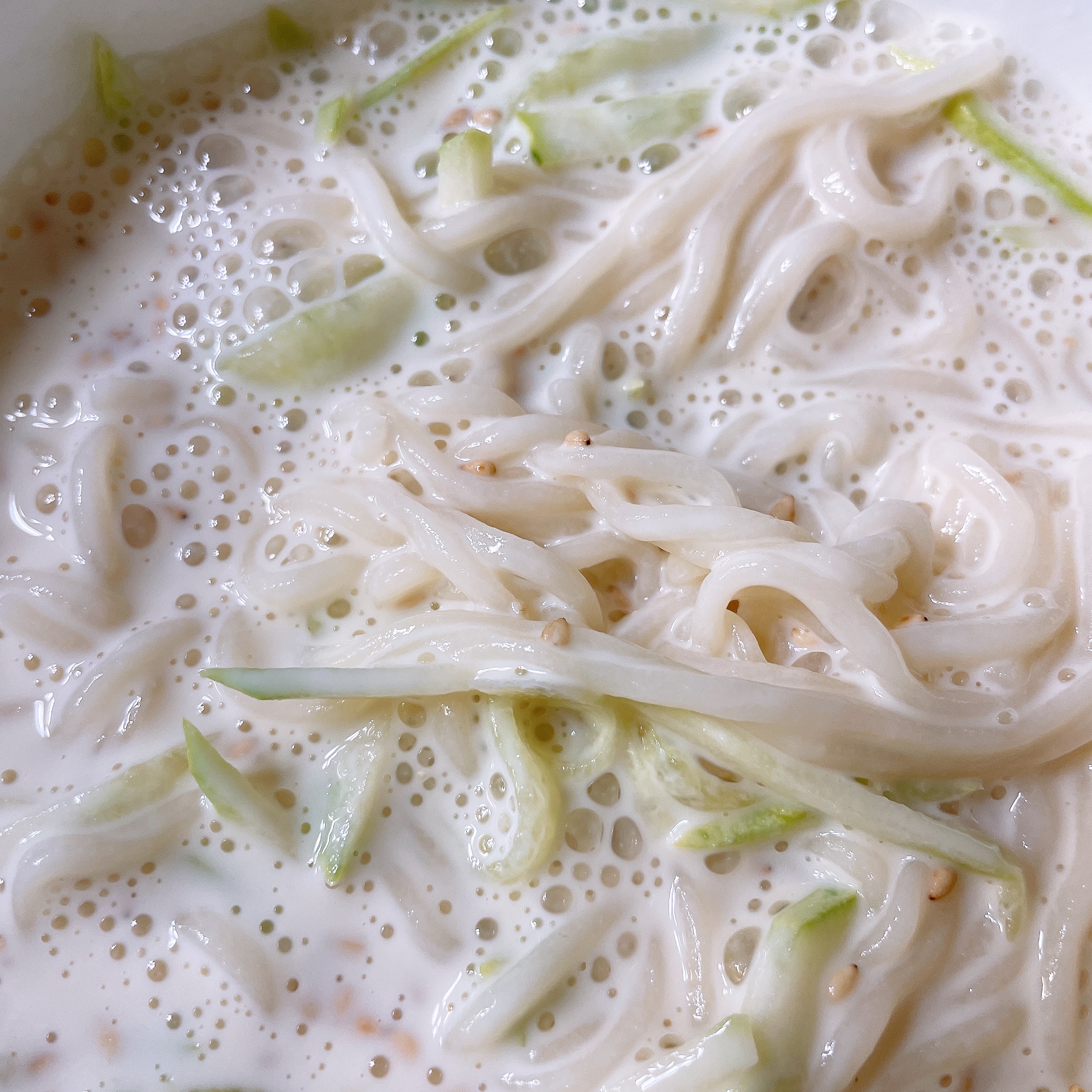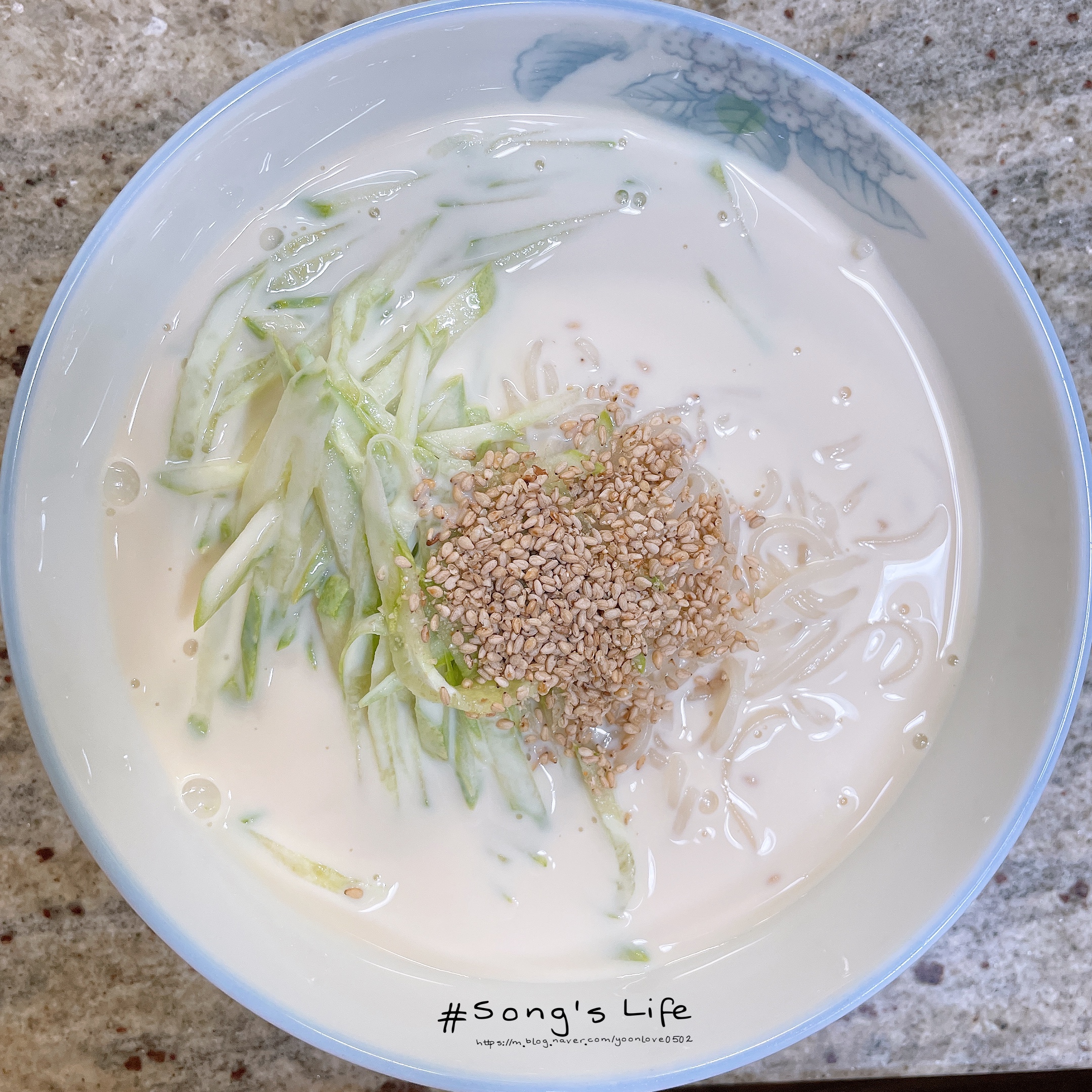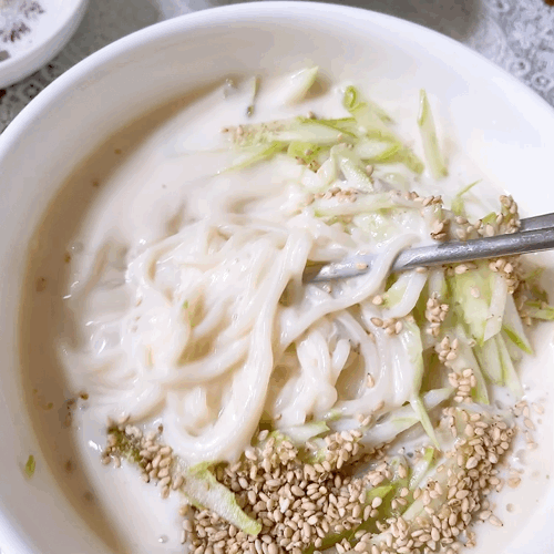 오이와 깨를 뿌리고 콩국물 부으면