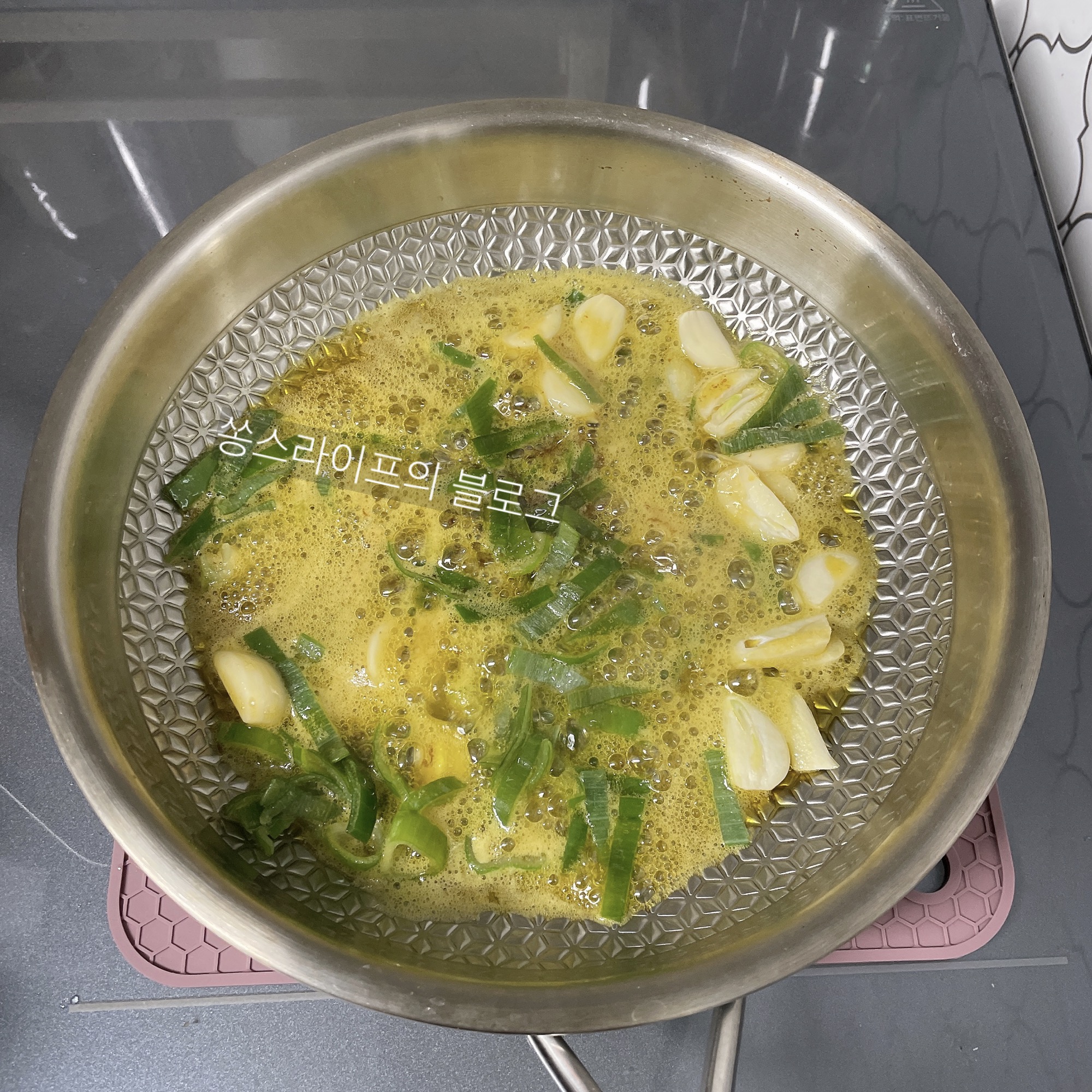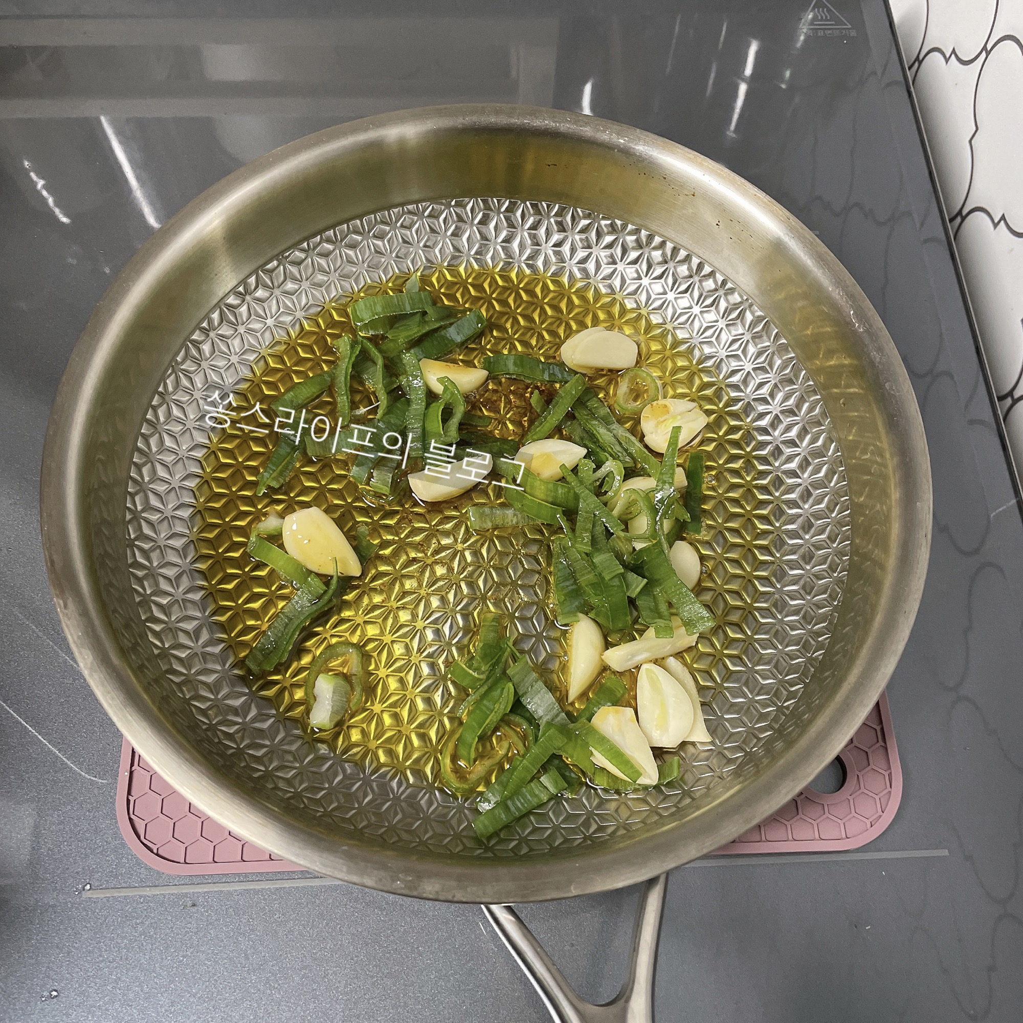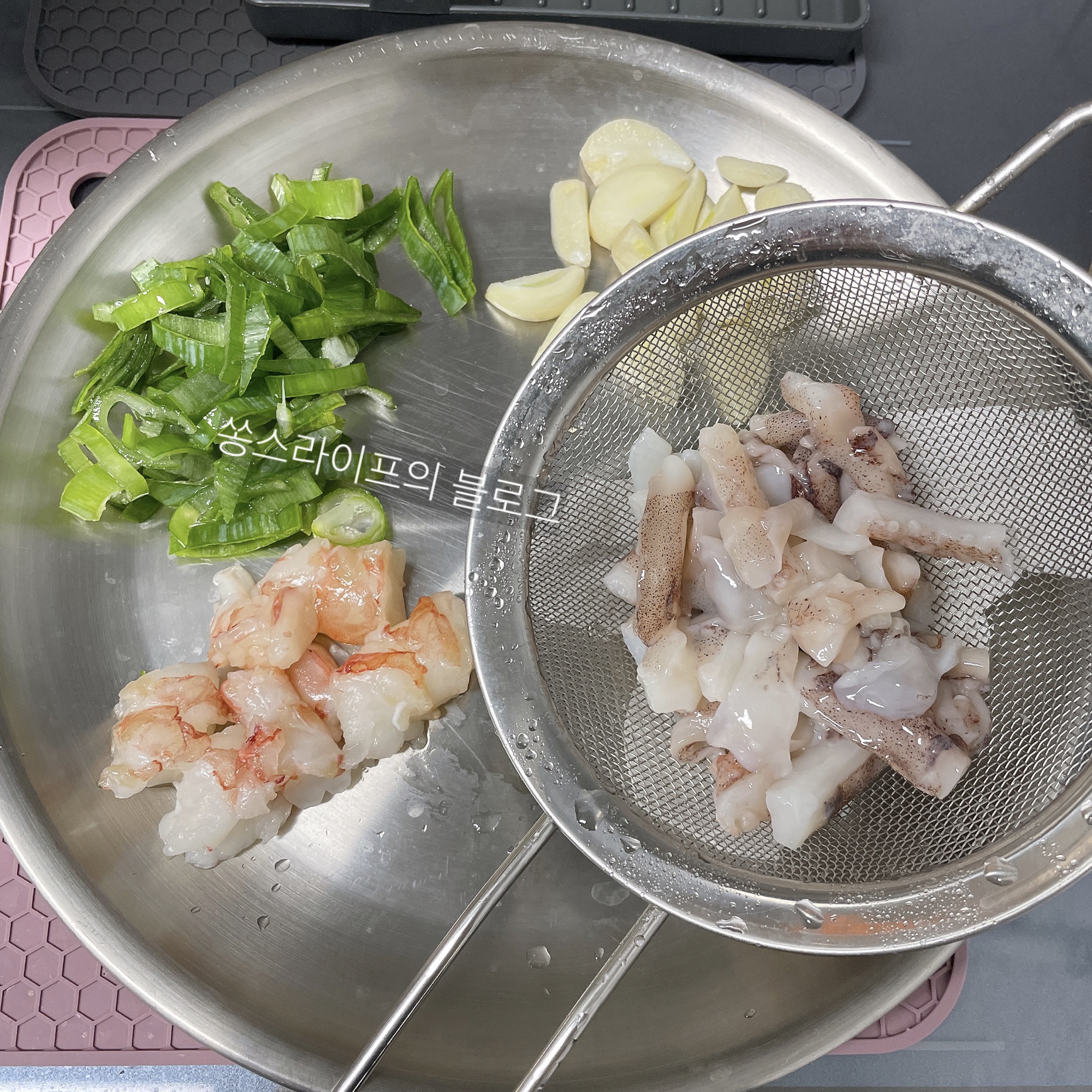 먼저 파, 새우, 마늘, 오징어를 손질해서 준비한다.